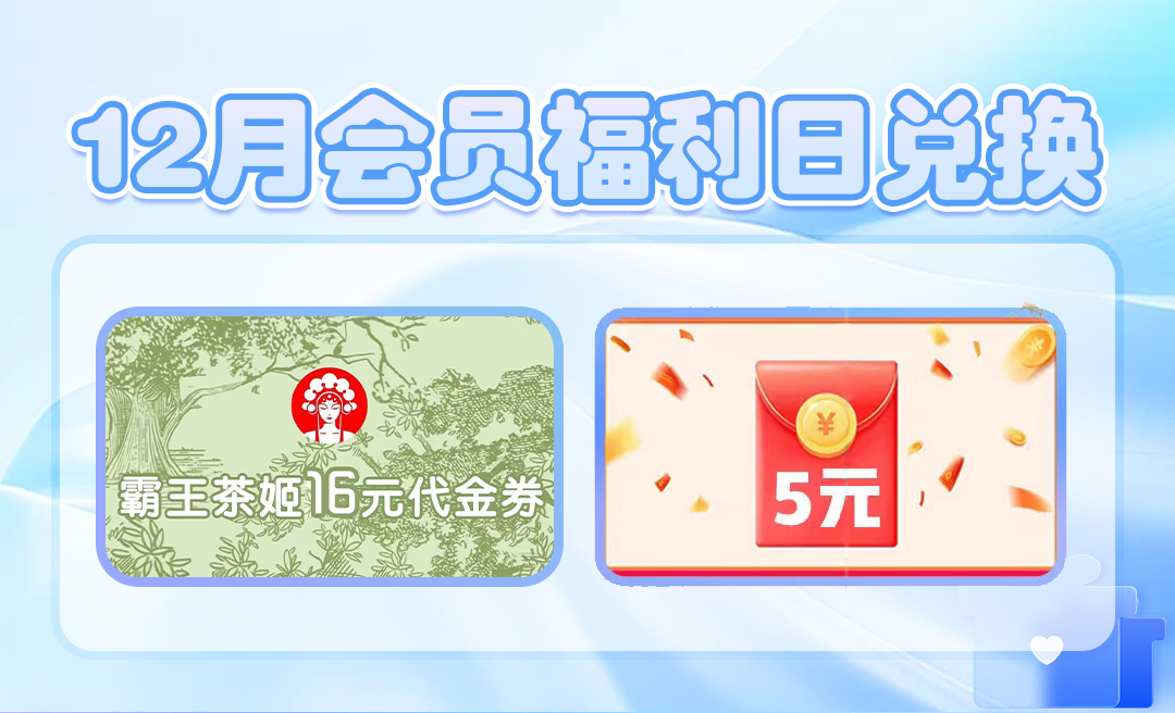 10:00—24:00,800客户端积分即可在积分商城兑换5元微信红包,2000积分可兑换霸王茶姬16元代金券(持年度权益卡用户还将享用积分9.5折优惠),奶茶券数量加倍!会员们请收下。