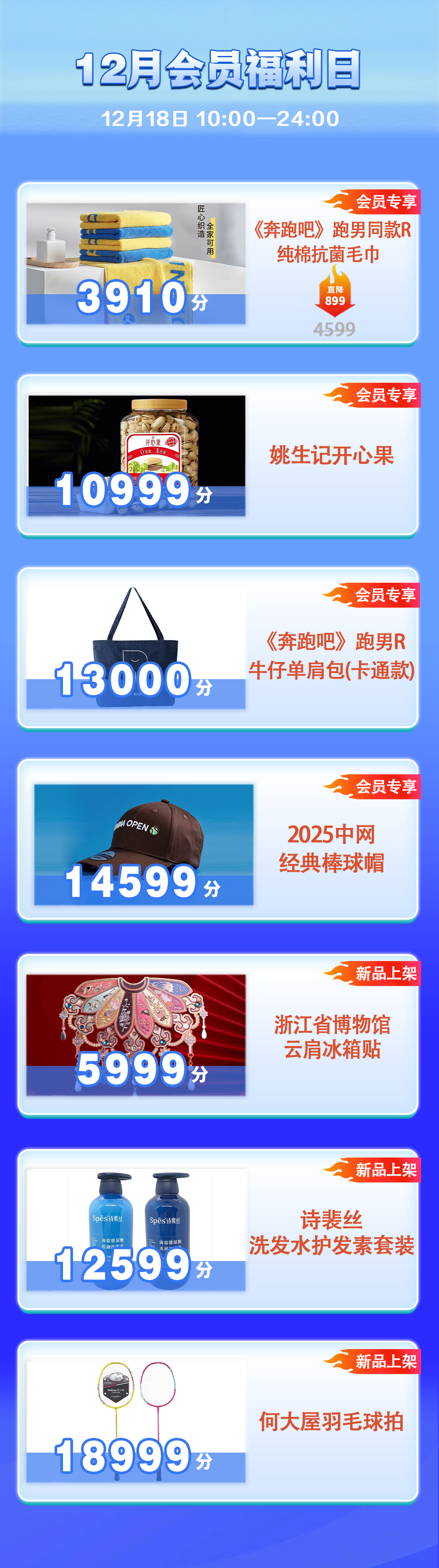 10:00—24:00,《奔跑吧》跑男R牛仔单肩包(卡通款)、2025中网经典棒球帽、姚生记开心果、《奔跑吧》跑男同款R纯棉抗菌毛巾四款会员专享好礼在积分商城限时定量上架;别的,浙江省博物馆云肩冰箱贴、诗裴丝洗发水护发素、何大屋羽毛球拍会在积分商城同步上新,浙江省博爆款文创凤冠冰箱贴也将发布抽签成果,快来get这些好礼吧!